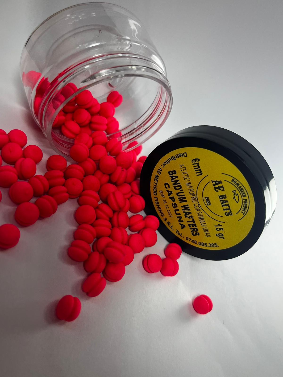 BAND’UM Wafters Capsuna sunt momeli flotante, critic echilibrate, de culoare roz, rotunde cu sant pe mijloc pentru a incorpora perfect ” banda elastica ” , ce au diametrul cuprins intre 5 si 6mm. Aceste wafters-uri se pot atasa pe banda elastica cu carlige de nr. 18/16/14/12 sau chiar 10, prezentarea fiind una versatila in functie de modul in care atasati momeala sau in functie de carligul folosit ( se pot echilibra clasic carligul fiind culcat pe substrat, ridicandu-se doar wafters-ul sau in modul varf-coada, carligul fiind la limita dintre a ramane pe substrat si de a se desprinde ). Mixul din care sunt realizate este unul premium, textura, culorile si aromele pastrandu-se intacte o perioada indelungata de timp, daca borcanul va fi tinut in conditii ferite de razele solare, iar noi va recomandam sa deschideti borcanul strict la utilizare, iar mai apoi sa va asigurati ca ati strans corect capacul pe recipient.